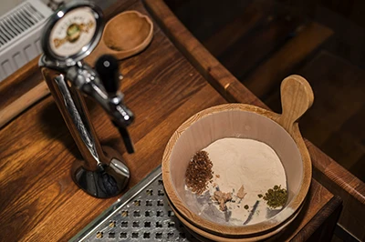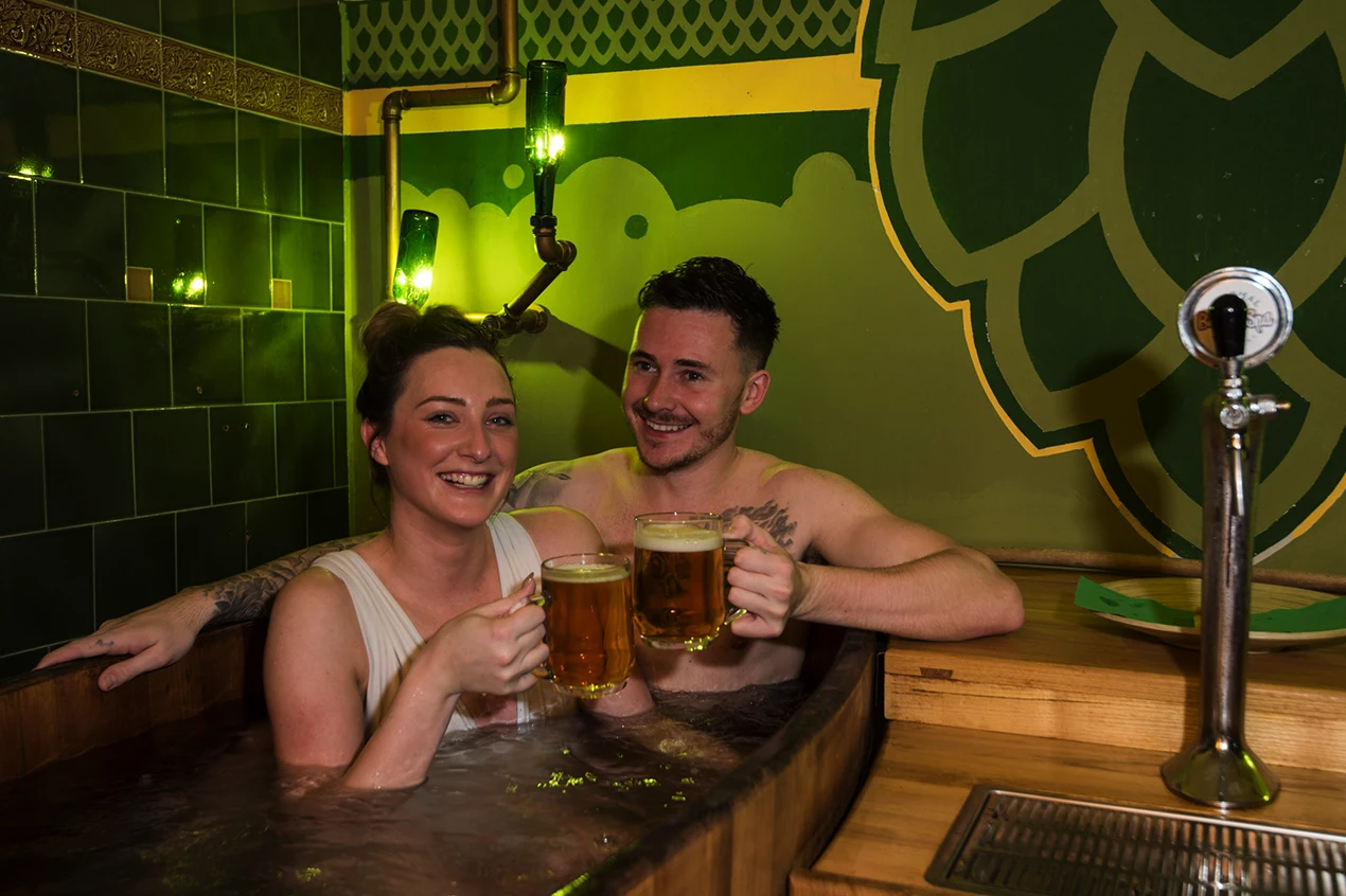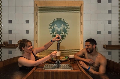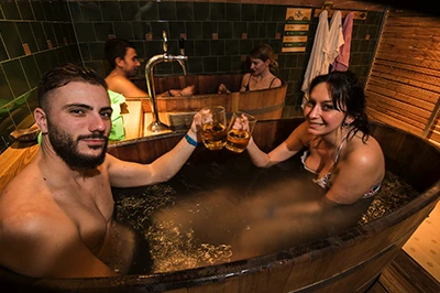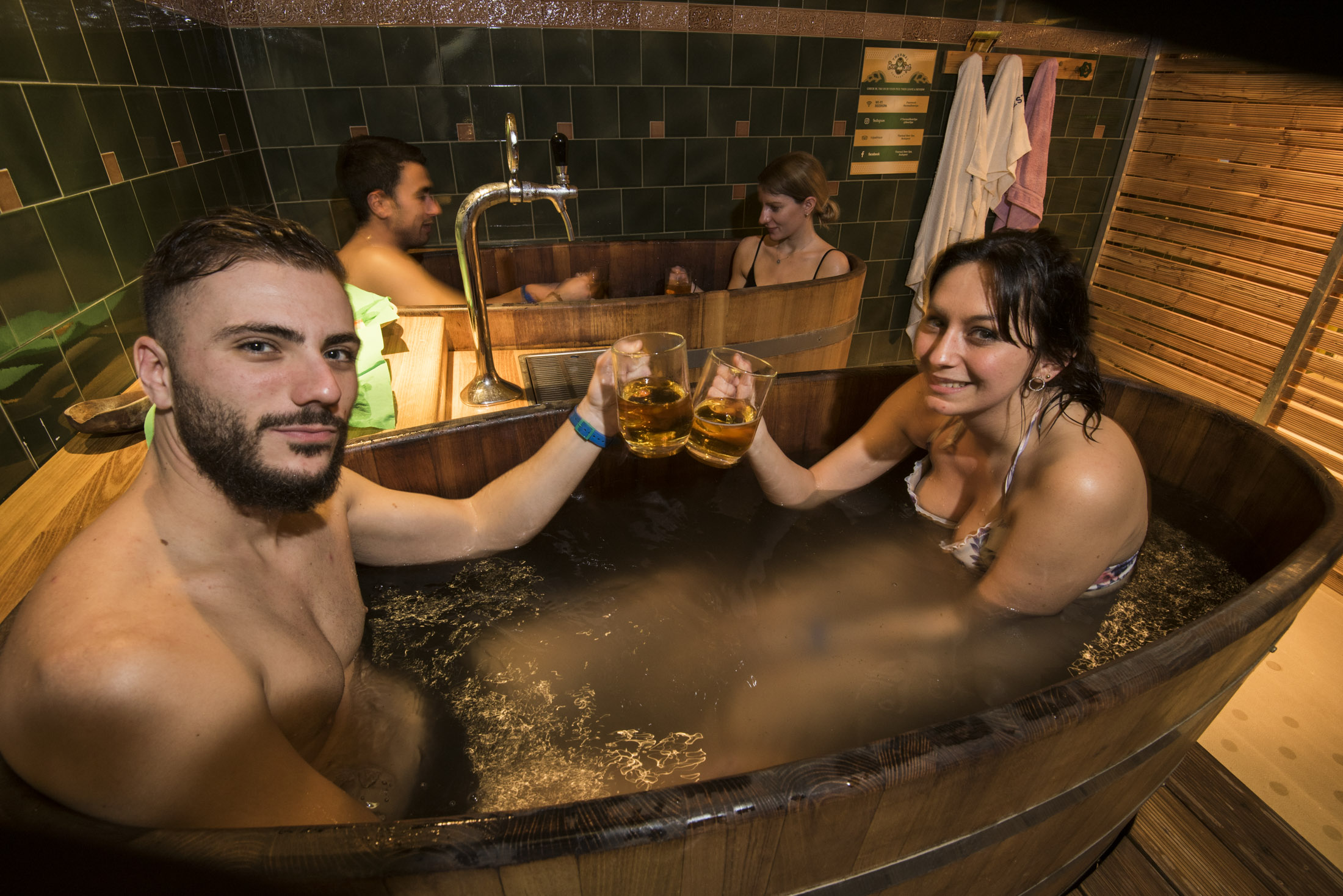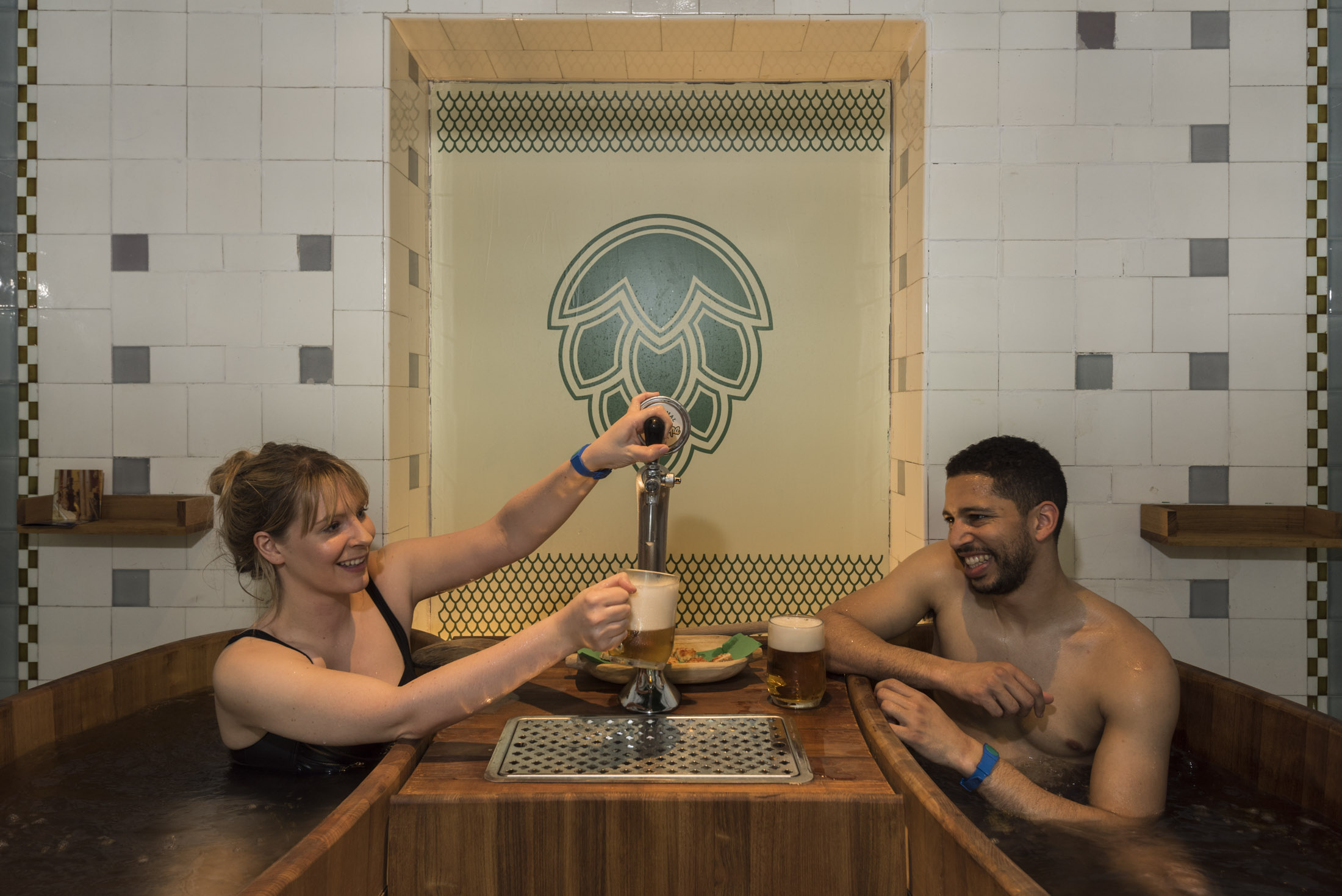 You have 45 minutes to soak up the dry beer ingredients (hops, malt, beer yeast, special beer salt) mixed with fresh thermal water while drinking as much beer as you like from the taps beside the tub. Click for more info.